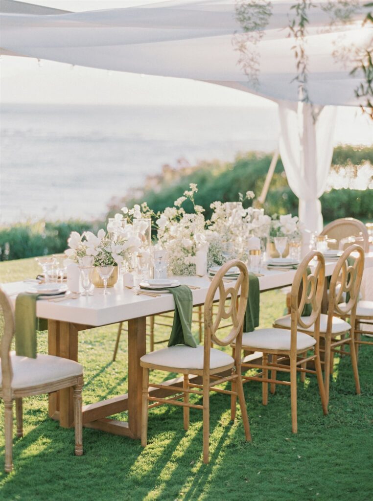 Destination Hawaii Wedding Reception on Maui : Inside a large tent there were stands of botanical greenery hanging above the guest tables giving a feel of “jungle island vibe “over the romantic European table centerpieces. There was a mixture of custom white wooden tables and round tables with luxe linens, beautiful candles & perfect lighting through out the clear top tent. The views are magnificent from this stunning wedding venue location on the island of Maui